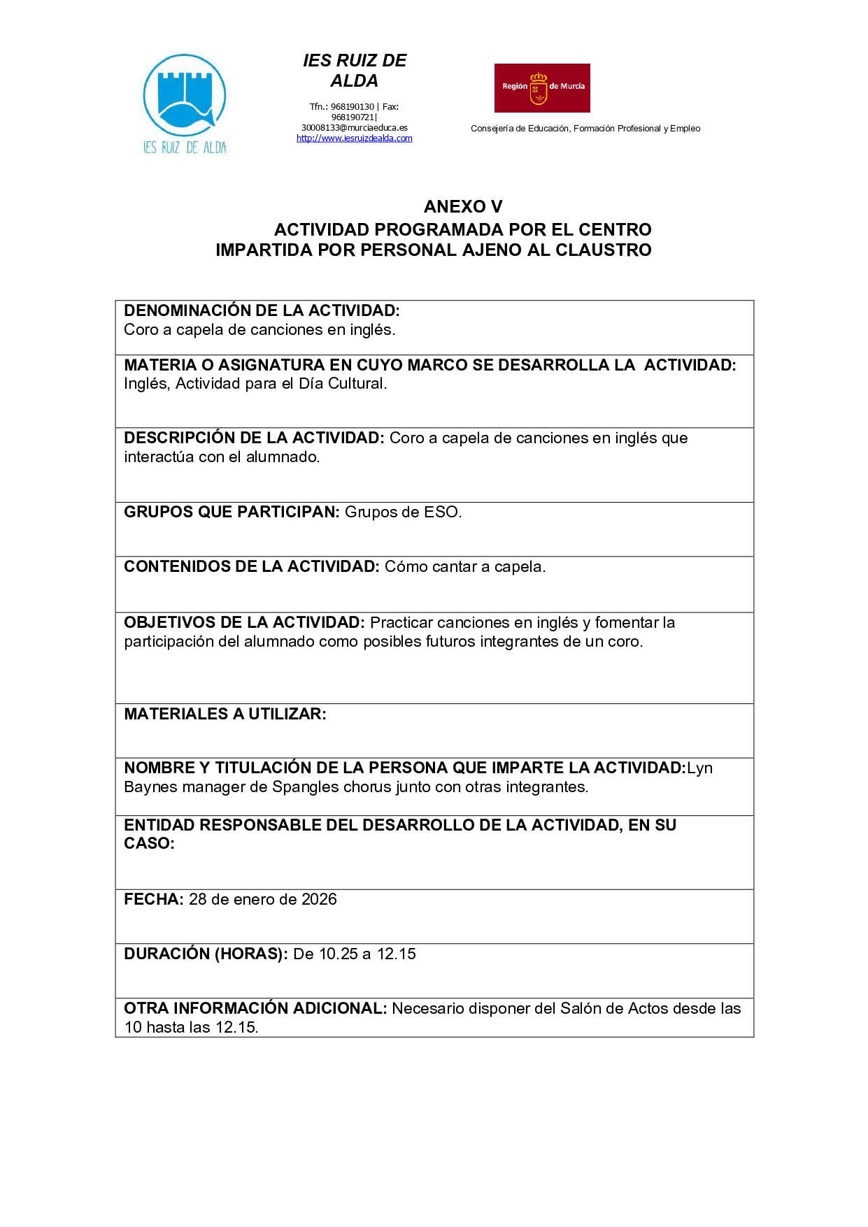 • 28 de enero de 2026. Coro a capela de canciones en inglés. Actividad para el Día Cultural. Grupos de ESO. Información de la actividad