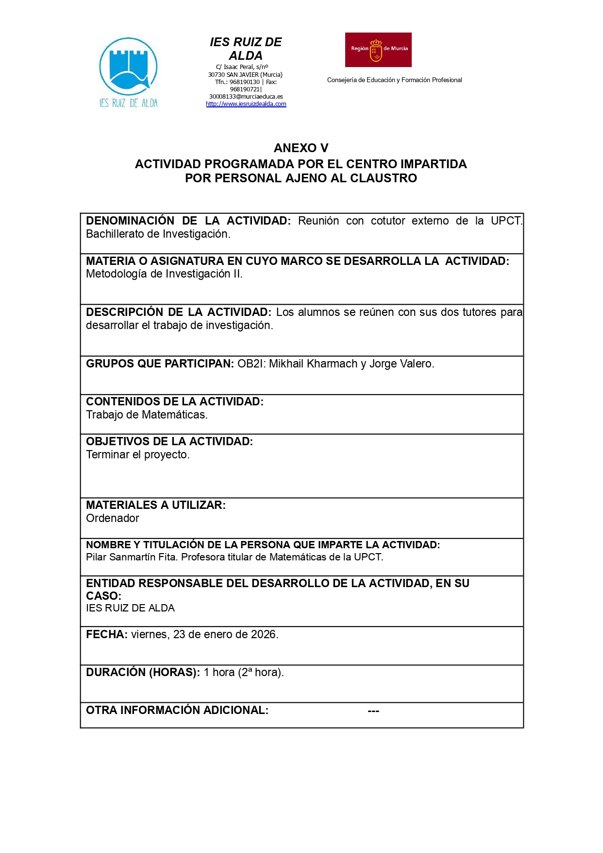 • 30 de septiembre de 2025:  TUTORÍA 2º DE BACHILLERATO DE INVESTIGACIÓN. Dos alumnos de 2º de Bachillerato de Investigación, desde las 11:20 hasta las 12:15.  Información de la actividad