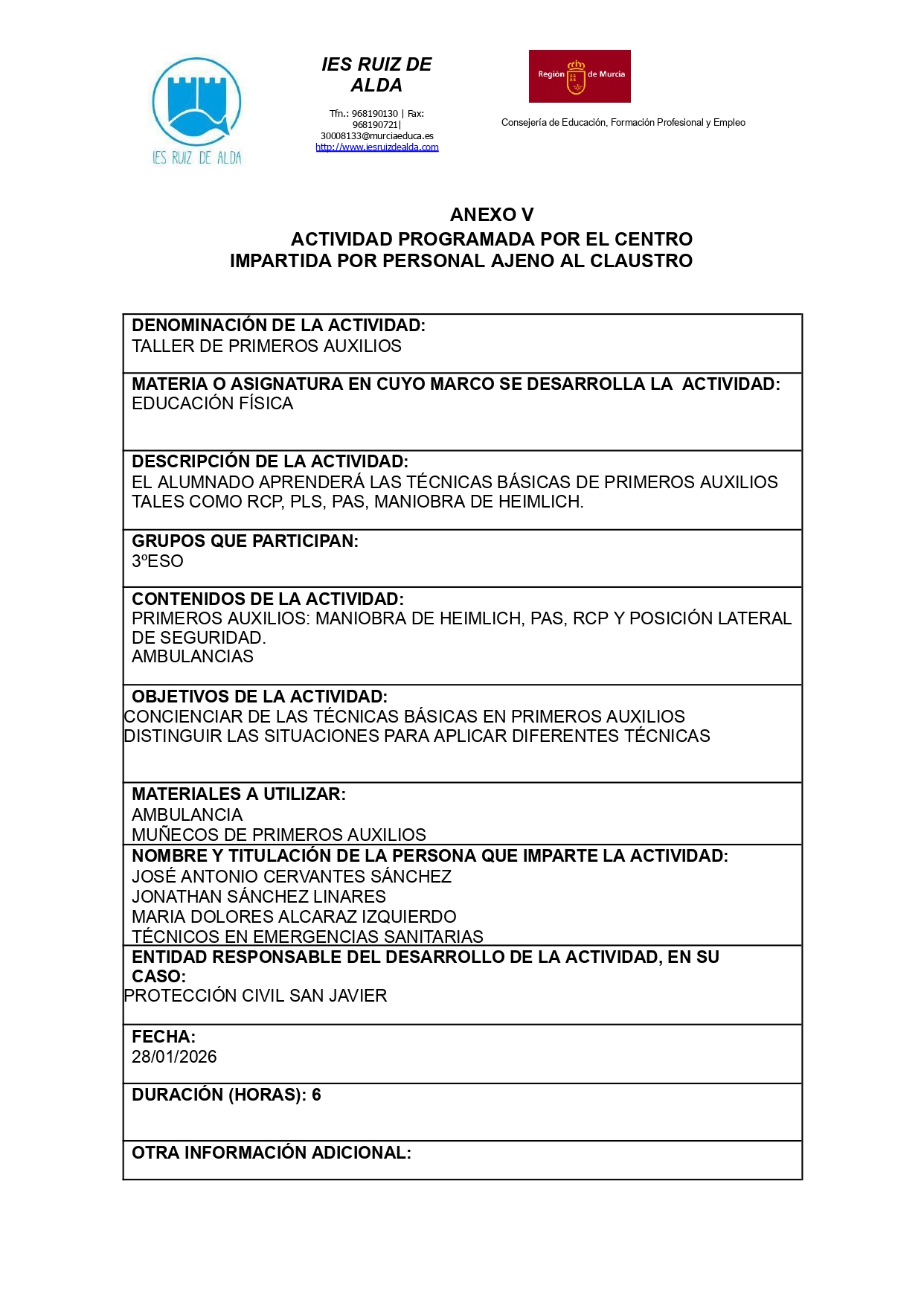 • 28 de enero de 2026. Taller de primeros auxilios. Alumnos de 3º de ESO. Información de la actividad