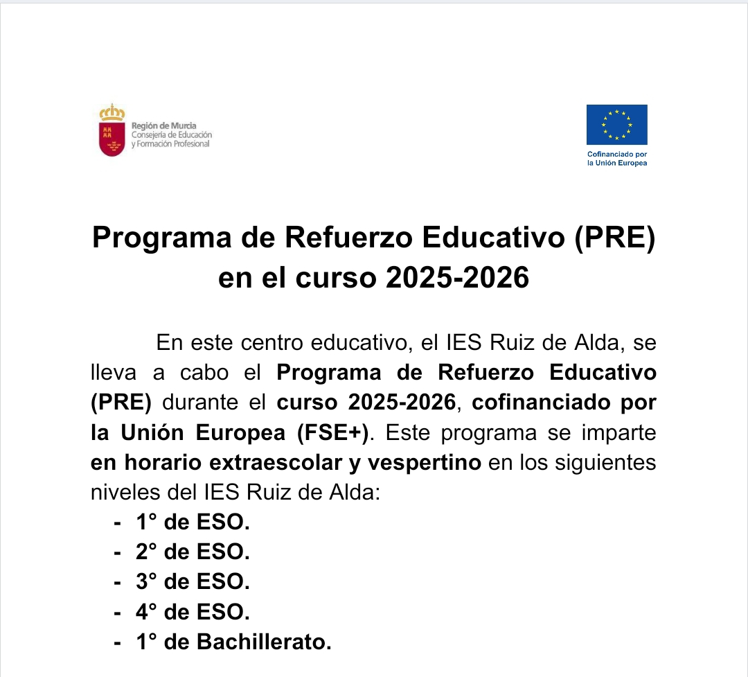 En cumplimiento de las INSTRUCCIONES DE 3 DE ENERO DE 2024 DE LA DIRECCIÓN GENERAL DE RECURSOS HUMANOS, PLANIFICACIÓN EDUCATIVA E INNOVACIÓN SOBRE DETERMINADOS ASPECTOS PARA LA REGULACIÓN DEL USO DE LOS TELÉFONOS MÓVILES, en el IES Ruiz De Alda no está permitido que el alumnado utilice teléfonos móviles ni otros dispositivos electrónicos durante la jornada escolar, entendida como el espacio de tiempo que incluye el horario lectivo, tiempo de recreo y los periodos dedicados al desarrollo de las actividades complementarias y extraescolares, salvo que esté expresamente previsto en el proyecto educativo del centro con fines didácticos. Se entenderá también como uso el hecho de mantener operativos dichos dispositivos.
